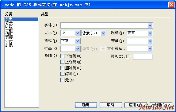 创建CSS样式表的过程,就是对各种CSS属性的设置过程,所以了解和掌握属性设置非常重要。在DW MX 2004的CSS样式里包含了W3C规范定义的所有CSS1的属性,把这些属性分为:类型、背景、区块、方框、边框、列表、定位、扩展等八个部分,如下图: