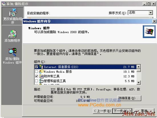 (1)从【开始】菜单,单击【控制面板】。 (2)双击【添加或删除程序】。 (3)单击【添加/删除Windows组件】。 (4)在“组件”列表框中,单击“应用程序服务器”。 (5)单击“详细信息”。 (6)单击“Internet信息服务管理器”。 (7)单击“详细信息”以查看IIS可选组件的列表。 (8)选择要安装的所有可选组件。 (9)单击“确定”,直到返回到【Windows 组件向导】。 (10)单击“下一步”,然后完成【Windows 组件向导】。