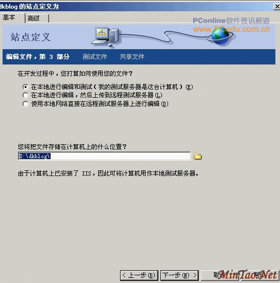 (4)单击“下一步”,选择“在本地进行编辑和测试(我的测试服务器是这台计算机)(E)”,把文件存储指向“D:\dkblog”,如图2-8所示。