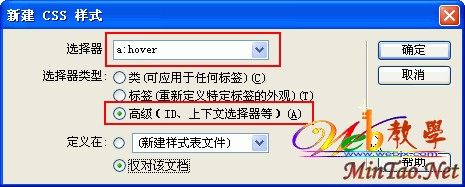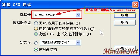 2、按SHIFT+F11,打开css styles控制面板,新建一css样式,需要注意的是,你选择器类型为:高级(ID、上下文选择器等),再选择选择器a:hover,并没有出现上图的效果,其实技巧就是在这里!我们手动把a:hove改成a.one:hove,也就是在a的后面加上一个点与名字(可任意英文,不能是数字)。设置好后点确定。如下图: