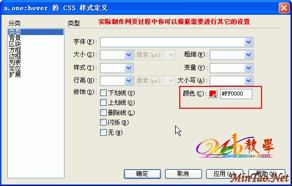3:在弹出的a。one:hover 的 CSS 样式定义对话框中设置你要的效果,这里我们选择字体的颜色为红色。设置完后点“确定”。如下图: