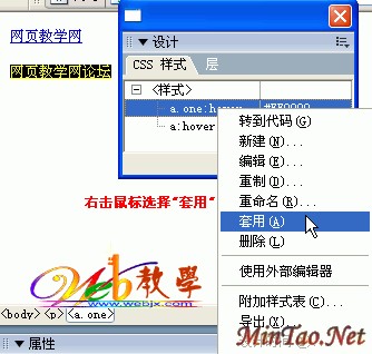 6、在页面中选中其中你想要当鼠标放上去的时候是红色的链接文字,再在CSS样式面板中用鼠标右击a.one:hover,然后选择“套用”。如下图: