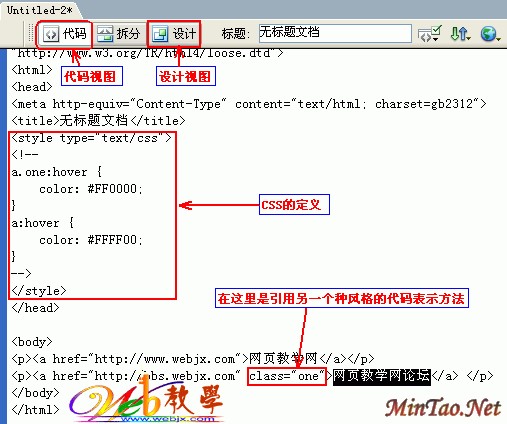 总结:按照以上逻辑,我们可以做出无限个文字链接效果,关键是在于a:hover a:active a:link a:visited的修改而已,前面介绍的只是a:hover,其实其他三个一样可以。只要参照第2步的设置就可以轻松的搞定。最后嘱咐大家一句,我们制作网页不能只学会设计工具(Dreamweaver等设计软件)就算学会了网页制作了,关键是大家必须懂得代码。这时我们可以打开“代码视图”看看效果: