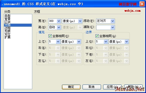 使用“CSS 样式定义”对话框的方框(又称盒子)类别可以为控制元素在页面上的放置方式的标签和属性定义设置。可以在应用填充和边距设置时将设置应用于元素的各个边,也可以使用“全部相同”设置将相同的设置应用于元素的所有边。