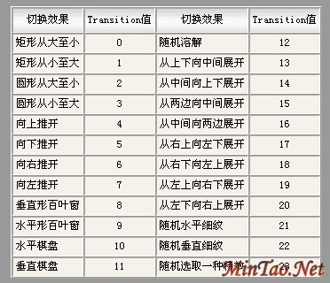 你只要改变“Transition"的值,就能获得不同的效果。它必须借助于Javascript才能实现,Javascript的设置方法请参考【BlendTrans属性】。
