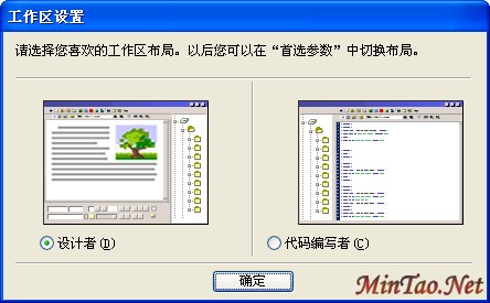 Dreamweaver MX 2004 具有全新的风格和启动画面,请去baidu或google搜索这个软件下载并安装,在此不做详细介绍。Dreamweaver MX 2004提供了面向设计人员的布局和面向手工编码人员需求的布局。首次启动Dreamweaver MX 2004时,会出现一个工作区设置对话框(如下图):