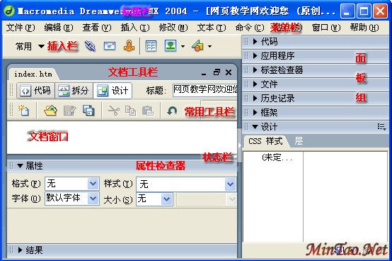 Dreamweaver MX 2004提供了一个将全部元素置于一个窗口中的集成布局。在集成的工作区中,全部窗口和面板都被集成到一个应用程序窗口中。(如下图)