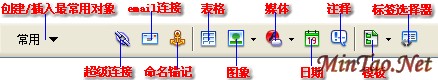 插入栏(如下图):包含用于将各种类型的“对象”(如图像、表格和层)插入到文档中的按钮。每个对象都是一段 HTML 代码,允许您在插入它时设置不同的属性。例如,您可以通过单击“插入”栏中的“表格”按钮插入一个表格。也可以不使用“插入”栏而使用“插入”菜单插入对象。
