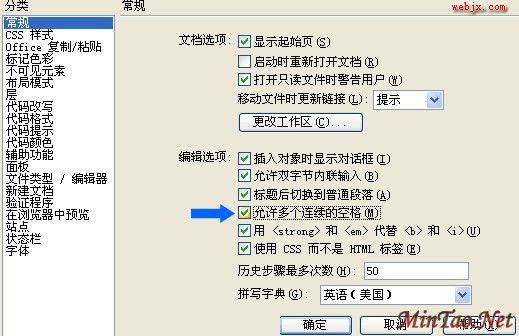 (1)在编辑网页的时候,有时根据排版要求或其它原因需要输入空格,DW MX 2004提 供了对 中文输入的最好的支持。首先进行一下设置:点“编辑”菜单-->>“首选参数”-->>“常规”,勾选“允许多个连续的空格”。如下图: