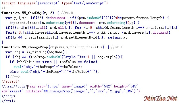 举例:在网页中插入一个图片,并且设置图片的名字为image1,最终要求:浏览者用鼠标单击图片时,图片变为另一幅(你要事先准备好哦!)。如下图: