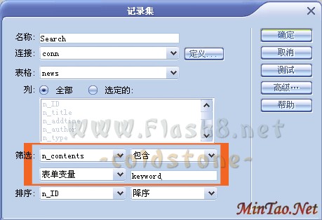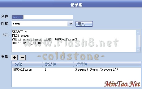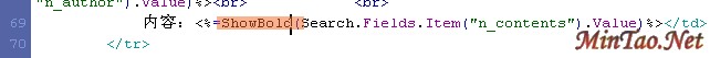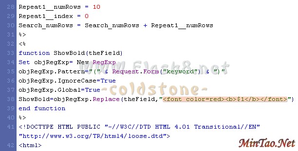 <% function ShowBold(theFIEld) Set objRegExp= New RegExp objRegExp.Pattern="(" & Request.Form("keyword") & ")" 其中的keyword要和index.htm中文本框的名字一致 objRegExp.IgnoreCase=True objRegExp.Global=True ShowBold=objRegExp.Replace(theField,"<font color=red><b>$1</b></font>") end function %>