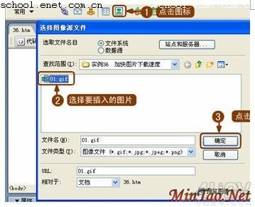 ( 2 )保存页面并插入图片。为了在插入图片时不提示相对路径,先保存页面为“ 36.htm ”。然后插入要预载的图片,如图 36-2 所示。