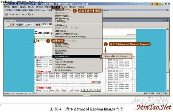 ( 2 )调用命令。打开本实例源文件夹中的 banner.htm 文件,将光标置于要插入广告的位置上,并调出【 AdvancedRandomImages 】命令,如图 38-4 所示。