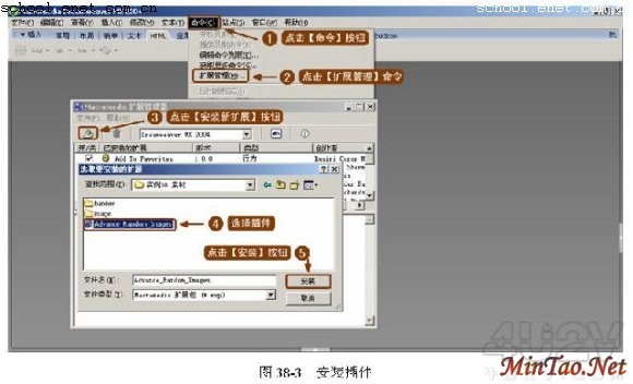 ( 1 )安装插件。使用菜单栏中的【命令】|【扩展管理】命令调出【 Macromedia 扩展管理器】对话框,安装 Advance_Random_Images 扩展,如图 38-3 所示。