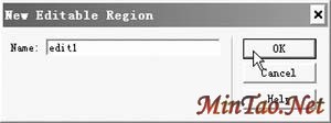 最重要的工作就是设置模板可编辑区域,否则的话,使用此模板生成的页面将是无法编辑的。首先我们选中页面标题区的单元格,然后执行菜单“Modify/Templates/New Editable Region”命令建立一个新的可编辑区。此时会打开一个对话框(如图2),输入可编辑区域名称为“edit1”,然后按下“OK”按钮,这样页面中就生成了一个{}包围的可编辑区域的标记,表示当前区域为可编辑区。同样道理设置好正文可编辑区域。并将模板保存退出。