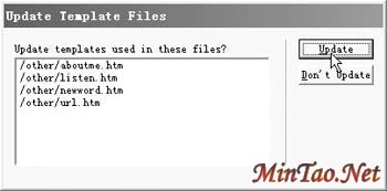 有的时候需要修改某个模板,改变网页的风格。此时可以打开模板文件,然后进行修改即可。模板修改并保存后,系统还会弹出一个对话框(如图4),提示是否同时更新模板所关联的相应网页,此时只要单击“Update”按钮即可立即将所有采用此模板制作的网页同时更新,从而实现了修改一个页面即可使整个网站面貌焕然一新,大大地提高了工作效率。