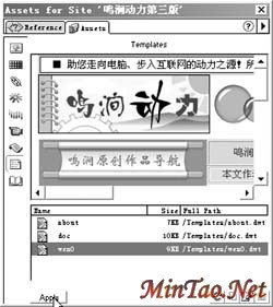 在Dreamweaver中建立一个新页面,然后执行菜单“Window/Templates”命令打开模板控制面板,在模板列表区域选择一个已经建立好的模板,然后单击面板上的“Apply”按钮即可将此模板应用到页面上了(如图3)。需要注意的是,应用以后,页面中黄色部分是不可编辑区,此时可以在可编辑区中将包含的文字删除,填写相应的内容,这样就可以快速制作出一个网页文件了。