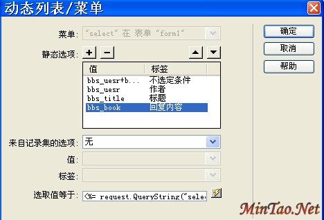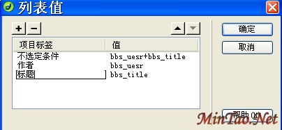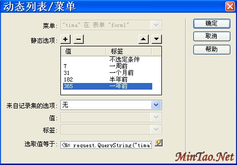 上图中的“不选定条件”值为空,稍后在记录集中设置它的默认值。其它的你自己可以任意添加选项和时间,一天前值为1,一年前值为365,依此类推。