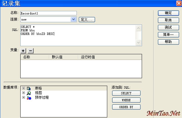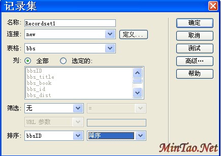 启动“记录集”对话框,在简单记录集中设置好连接和数据数据库表,如下:
