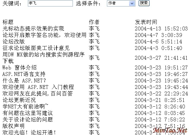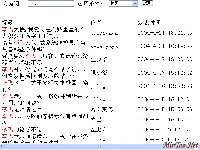 实例三、按标题、作者、回复内容及发表时间搜索记录。