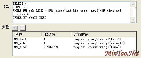 这里比上例多了一个时间筛选条件bbs_tima>=now()-MM_tima,nwo()是获取当前系统日期时间的一个函数,用它减去选定多少天前的变量值,即可筛出发表时间大于或等于多少天前的记录。