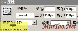 5、然后再将光标置入图层layer1,点击菜单 [插入——层] 再插入一个长500高130的图层layer2;并将layer2的属性中左边距和上边距都设置为0,并为它指定一个你喜欢的背景色。