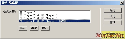 13、怎么样,看到了吧:)我们再给图层添加上一个简单的关闭动作,就是点击关闭按钮后图层隐藏。选择上关闭按钮,转到行为面板,点击 在出来的菜单中选择 [显示隐藏层] ,在跳出的窗体中选择上layer4,然后点击下面的隐藏按钮,将其设置为隐藏,如图9: