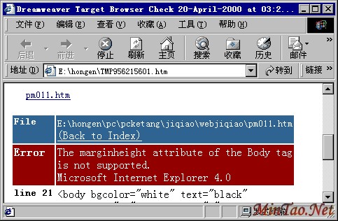 我们一般选择“IE 4.0”和“Netscape4.0”检查即可,如果检查结果发现有浏览器不支持的地方,我们在测试结果窗口中能够看到是哪个语句有问题,我们只须做相应的修改即可。