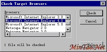 由于我们制作的网页上传后,并不能知道网友使用何种浏览器,而我们应用在网页制作中的有些技巧,并不是所有的浏览器都能支持的,也就是说别人也许看不到网页应有的效果,甚至是一团糟,所以我们必须保证自己的网页被主流的浏览器所支持。Dreamwaver提供了这样一个功能,即检查目标浏览器,我们在Site中选中要测试的文件,然后在“File”菜单中找到“Check Target browser”并单击,这时会弹出一个对话框。