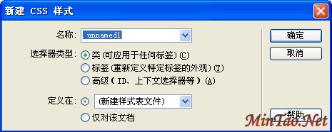 注意:类名称必须以句点开头,并且可以包含任何字母和数字组合(例如,.mycss)。如果您没有输入开头的句点,DW MX 2004将自动为您输入。