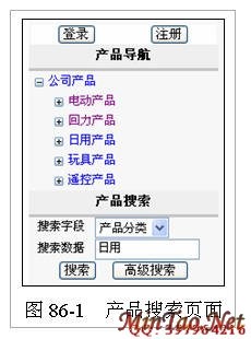在“ index.aspx ”页面中添加下拉列表、文本框及按钮,完成产品搜索页面的设置,制作出跟实例 85 中树形目录索引显示页面相同的页面作为产品搜索页面,然后设置程序以实现产品搜索。