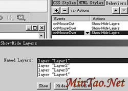 图2 行为的妙用主要体现在:如果我们要实现下拉菜单,关键就是让鼠标移到“产品中心”链接上时,使层显示;而鼠标离开链接时,使层隐藏。根据这种思想,我们首先为这个层设立两个Action,一个选择Hide,一个选择Show。然后,调整Event,将Hide Layer的Event设为OnMouseOut,即为鼠标离开链接;而将Show Layer的Event设为OnMouseOver,即为鼠标选中链接。按“F12”预览,就可看到我们期盼的效果。 这样,平时我们觉得很神秘的导航下拉菜单就可以轻易在行为中实现。还可以在导航链接上继续应用 “Swap Image”行为,实现鼠标点选链接时出现图片翻转效果。 行为不是一个个孤立的特效,可以由多个行为组合叠加实现复杂的功能,除了DW MX默认设置好的行为外,我们还可以从www.mcromedia.com上下载更多更酷的第三方行为,我们只需将它们直接复制到DreamweaverMX\Configuration\Behaviors\Actions\目录下即可,从而使DW MX的这一闪光点更加眩目。