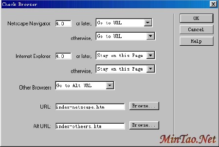 初看这个编辑窗口还有点害怕,有好多选项,搞清楚这个动作的机制就不必害怕了,这个动作是由一组复杂的条件语句完成的,根据判断的结果做出选择,在三个网页当中选其一。这个行为可以明确判断两种浏览器:Netscape 和Ie,不是这两种浏览器一概做Other Browser 处理。判断每一种浏览器都会有三种选项,Go to URL(打开一指定文件),Go to Alt URL(打开另一指定页面),Stay on this page(停留在该页面)。URL和Alt URL是定义Go to URL 和Go to Alt URL所指向的页面。