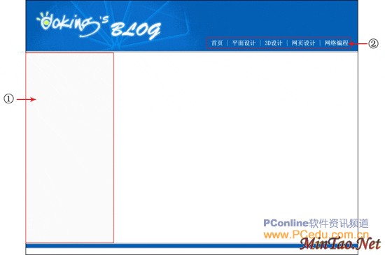 在图4-1-1中序号①画上红色方圈部分的是网页的左边栏目,目前是空白的,它的栏目在以后章节中会一一添加上去的,序号②画上红色方圈部分的是网站的导航条,它是由第三章建立的dkblog.mdb数据库中的LM表动态生成的。基本思路已清楚后,开始构建立网站的模板。