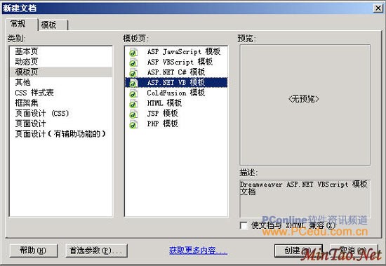 (1)打开【文件】→【新建】,打开【新文档】的对话框,选择“类别:”为“模板页”,选择“模板页:”为“ASP.NET VB 模板”,结果如图4-1-2所示。