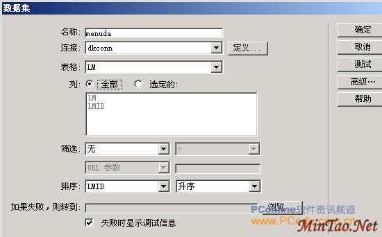 ③在弹出【数据集】对话框中,输入数据集名称为“menuda”,在连接下拉菜单中选择“dkconn”,在表格的下拉菜单中选择LM表,选择列为“全部”选项,在排序下拉菜单中选择字段“LMID”,设排序为升序,结果如图4-1-5所示: