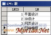 ①启动Access2003,打开dkblog.mdb数据库,在LM表的LM字段中按顺序输入平面设计、3D设计、网页设计、网络编程等4个记录,如图4-1-3 所示。