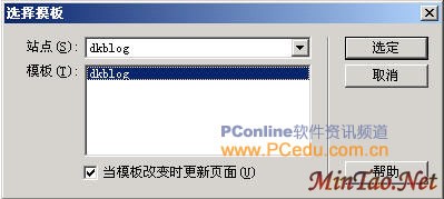 (1)新建“ASP.NET VB” 动态页,打开【修改】菜单→【模板】→【应用模板到页】,在弹出的【选择模板】对话框中,选择模板“dkblog”,单击“选择”按钮,如图4-1-12所示: