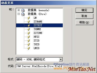 (3)切换到【服务器行为】面板,可以看已增添了许多动态文本,双击动态文本(Ztre.ZYTEXT),选格式为“编码—HTML编码格式”,如图4-2-6所示: