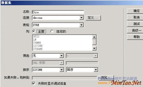 (1)返回到Dreamweaver,切换到【服务器行为】面板,单击“+”按钮,添加数据集Ztre,选择表格为刚才在Access中新建的查询ZTRE,其它的有关设置,如图4-2-4所示: