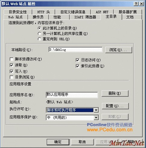 (2)右键单击“默认Web站点”,选择属性,打开【默认Web站点属性】对话框,在对话框中,单击【主目录】选项卡,把本地路径指向“D:\dkblog”,在“执行许可(P):”下拉菜单中选择“脚本和可执行程序”,结果如图2-3所示。