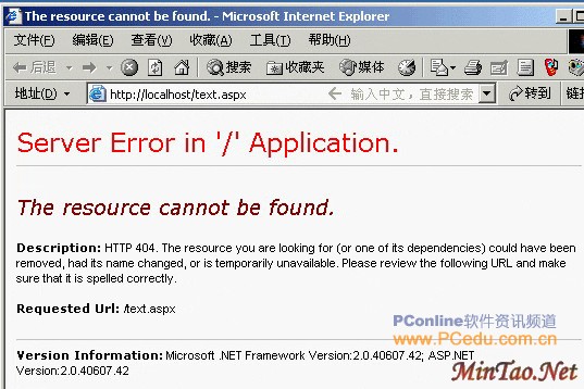 打开IE浏览器,在地址栏上打上“localhost/text.aspx”,假定text.aspx这个文档现在不存在,那么IE浏览器上一定会返回错误信息,如果出现如图2-4所示的错误信息,说明我ASP.NET的运行环境基本构建完毕。