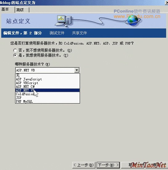 (3)单击“下一步”,选择“是,我想使用服务器技术。(Y)”,在“哪种服务器技术?(W)”下拉菜单中,选择“ASP.NET VB”,结果如图2-7所示。