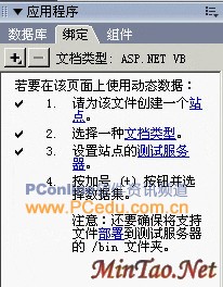 (2)在【文件】菜单中,选择【新建】,在【新建对话框】中,选择类别为“动态页”,选择动态页为“ASP.NET VB”,按“创建”按钮创建第一个动态网页。切换到【应用程序】面板,选择【绑定】选项卡,如图2-11所示。