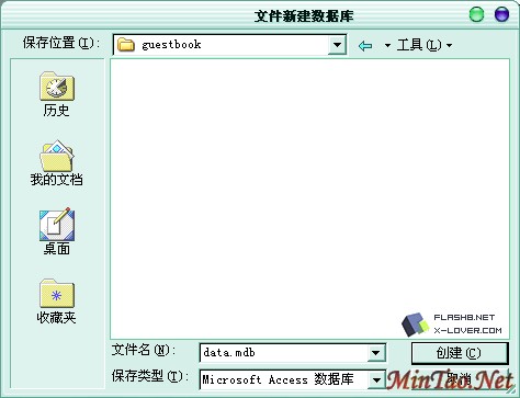 先构想一下,一个功能齐全的留言本应该有哪些内容需要保存?访客名字(Name)、访客主页(Homepage)、访客QQ(QQ)、访客信箱(Email)、访客形象 (ICON)、访客IP(IP)、留言内容(Content)、留言时间(Date)----这是访客的有关信息,如果主人要回复留言呢?好,再加上回复 (Reply)和回复时间(RDate),嗯......再想想有没有漏掉什么?对了,还有主人的管理帐号:用户名(Username)、密码 (Password)。要保存这么多信息,数据库应该怎么设计?访客的留言是不断增加的,而主人的管理帐号固定不变,所以应该分开两个表,一个保存所有访客的留言和访客的资料信息,另一个则保存主人的管理帐号。OK,现在可以开始设计数据库了。打开ACCESS(在微软的Office软件中有)软件,新建一空白数据库,ACCESS会提示先保存数据库,定位到你的留言本所在文件夹(笔者是在站点根目录下建了一个guestbook文件夹),保存为 data.mdb: