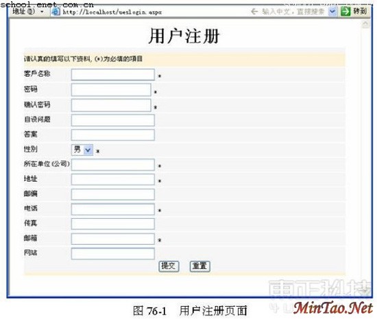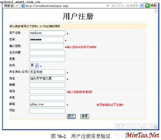 效果说明 用户通过“ uselogin.aspx ”注册成为公司的客户,如图 76-1 所示,当用户提交注册信息时,再由它对注册信息进行有效验证,如 76-2 所示,从而对公司的用户注册信息进行管理。