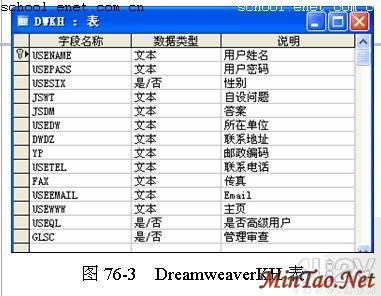 创作构思 通过 ASP.NET 验证服务器控件,可以对用户的注册信息进行验证。本实例需要用到实例 75 中创建的 Dreamweaver KH 表,如图 76-3 所示。该数据表用于存储用户的注册信息。用户名(即 USENMAE )必须是惟一值,用户注册后一般被定义为非高级用户(即 USEQL 字段被定义为“否”值),只有经过公司管理员审核通过后,才会把用户定义为高级用户。如果还没有通过公司管理员的审核,一般情况下 GLSC 字段都将定义为“否”,反之则定义为“是”。