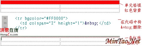 代码为: 我们将单元格内的占位字符“ ”删除,关闭HTML编辑窗口,表格第一行就显示为一条红线了(图2)。