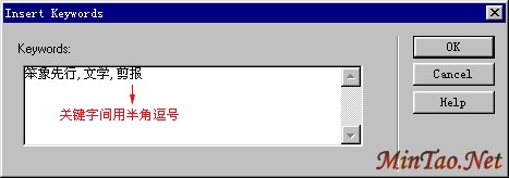 单击“Insert”菜单下的“Head”->“Keywords”,弹出插入关键字的对话框(图1),输入“笨象先行,文学,剪报”,点“