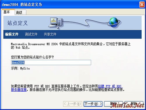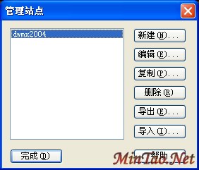 在 Dreamweaver MX 2004中,选择“站点”>“管理站点”。管理站点对话框中“dwmx2004”是在本教程第5页设置的,如果想回忆一下,请查看“设置站点”。